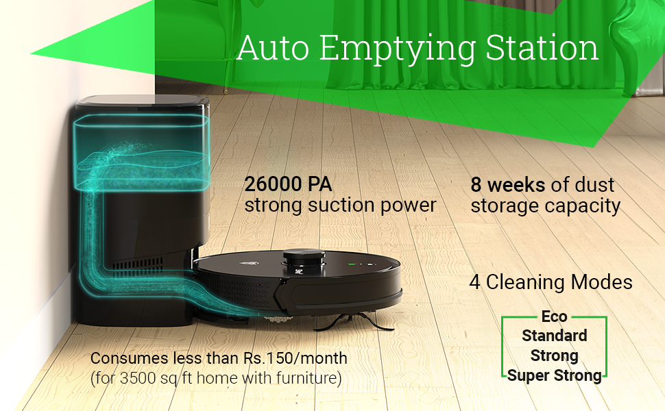 Auto Dust Collector: The robotic vacuum cleaner Auto-Empty Station, equipped with a replaceable dust bag, holds over 5 weeks worth of debris. With its self-emptying feature boasting 26000Pa dust-collection technology, it empties the dustbin in just 15 seconds. Plus, the auto-seal design of the dust bag ensures mess containment when disposing, a key feature enhancing its functionality as a home cleaning machine.