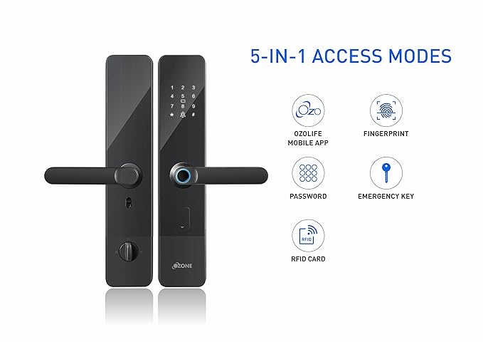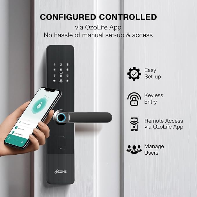 Ozone Smart Wi-Fi Lock for Wooden & Metal Doors, 4-Way Access, OzoLife App, Fingerprint, Password, RFID Card, 35-100 mm Door Thickness, Free Installation, 2 Years Warranty (Black | Antique Bronze)